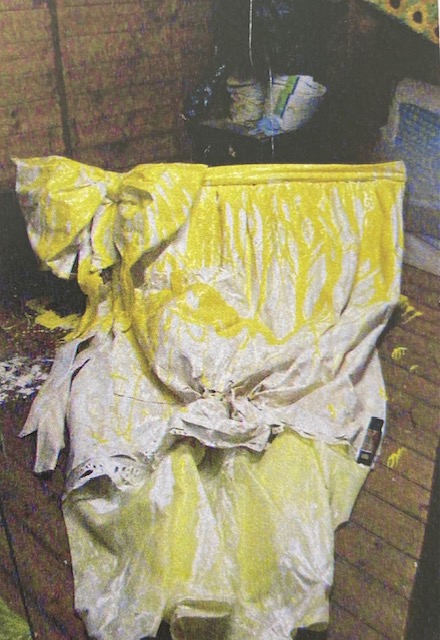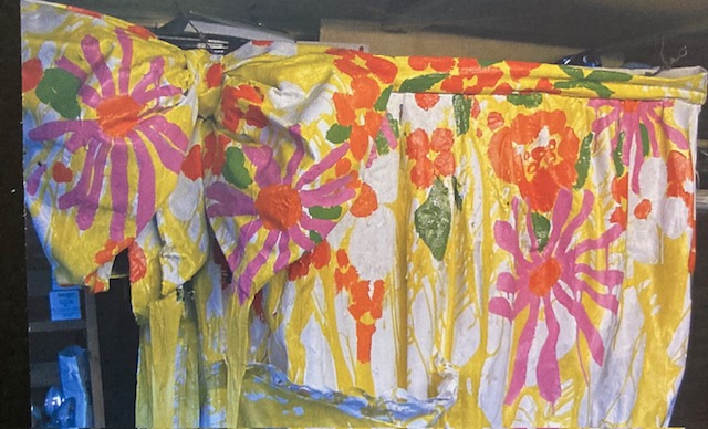 This example of an exaggerated apron hanging seamlessly, as if suspended from a domestic washing line, resembles an un -stretched canvas unfinished and unresolved. From beginning to end this sculptural canvas encrusted with trails of vibrant ink and enamels, descends autonomously, like vestiges from a painters easel.