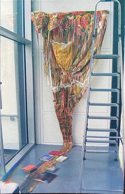 My sculptural works involve swathes of canvas, dripping with coloured medium, often hung in homage to an old master painting.